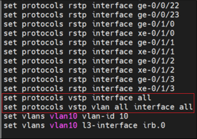 # delete protocols vstp force-version stp   //강제로 vstp 사용안함