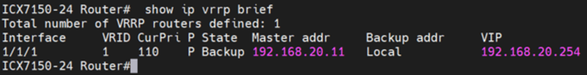 | Router vrrp interface ethernet 1/1/1 ip address 192.168.20.12 255.255.255.0 ip vrrp vrid 1 backup priority 110 advertise backup ip-address 192.168.20.254 activate |