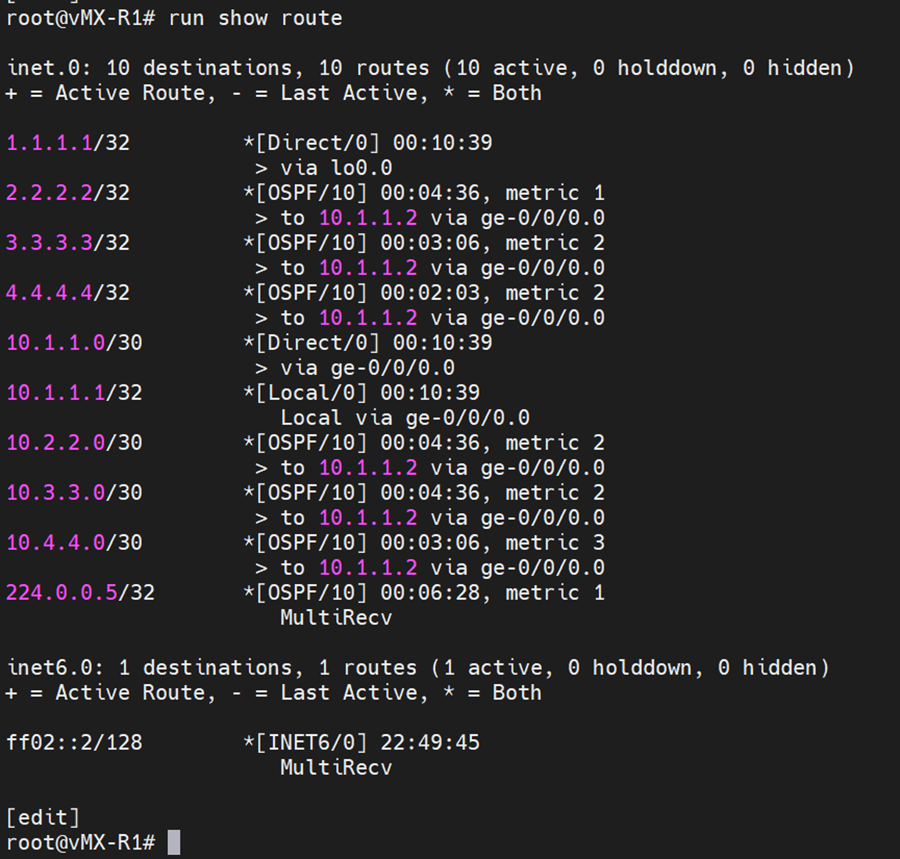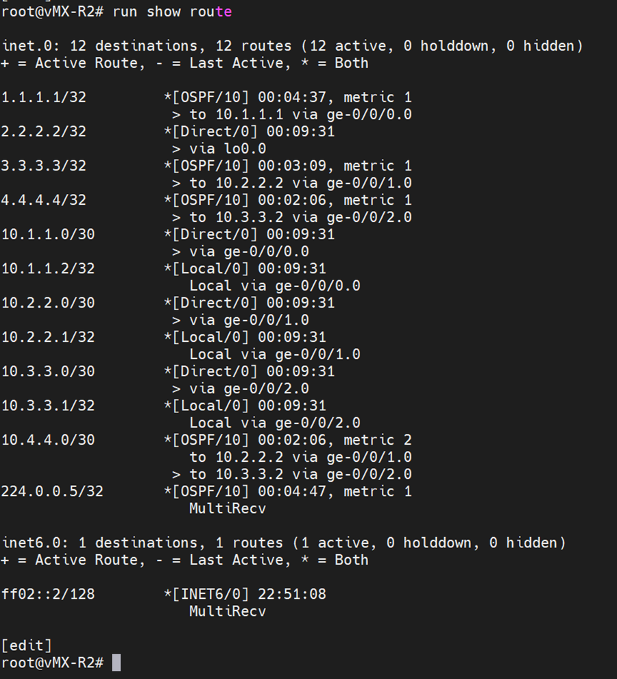 | R2: [edit] root@R2# set protocols ospf area 0.0.0.1 interface ge-0/0/0.0 [edit] root@R2# set protocols ospf area 0.0.0.0 interface ge-0/0/1.0 [edit] root@R2# set protocols ospf area 0.0.0.0 interface ge-0/0/2.0 [edit] root@R2# set protocols ospf area 0.0.0.0 interface lo0.0 |