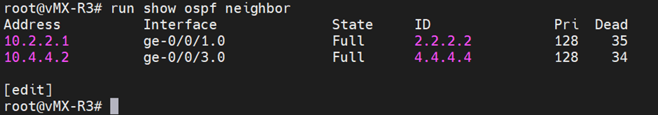 | R3: [edit] root@R3# set protocols ospf area 0.0.0.0 interface ge-0/0/1.0 [edit] root@R3# set protocols ospf area 0.0.0.0 interface ge-0/0/3.0 [edit] root@R3# set protocols ospf area 0.0.0.0 interface lo0.0 |
