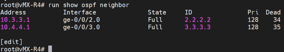 | R4: [edit] root@R4# set protocols ospf area 0.0.0.0 interface ge-0/0/2.0 [edit] root@R4# set protocols ospf area 0.0.0.0 interface ge-0/0/3.0 [edit] root@R4# set protocols ospf area 0.0.0.0 interface lo0.0 |