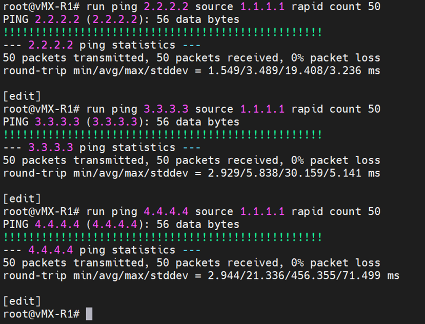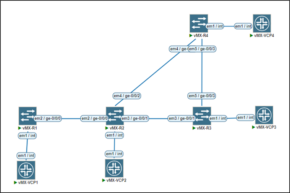 | R4: set interfaces ge-0/0/2 unit 0 family inet address 10.3.3.2/30 set interfaces ge-0/0/3 unit 0 family inet address 10.4.4.2/30 set interfaces lo0 unit 0 family inet address 4.4.4.4/32 |