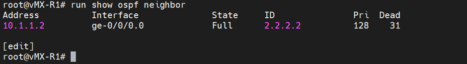 | R1: [edit] root@R1# set protocols ospf area 0.0.0.1 interface ge-0/0/0.0 [edit] root@R1# set protocols ospf area 0.0.0.1 interface lo0.0 |