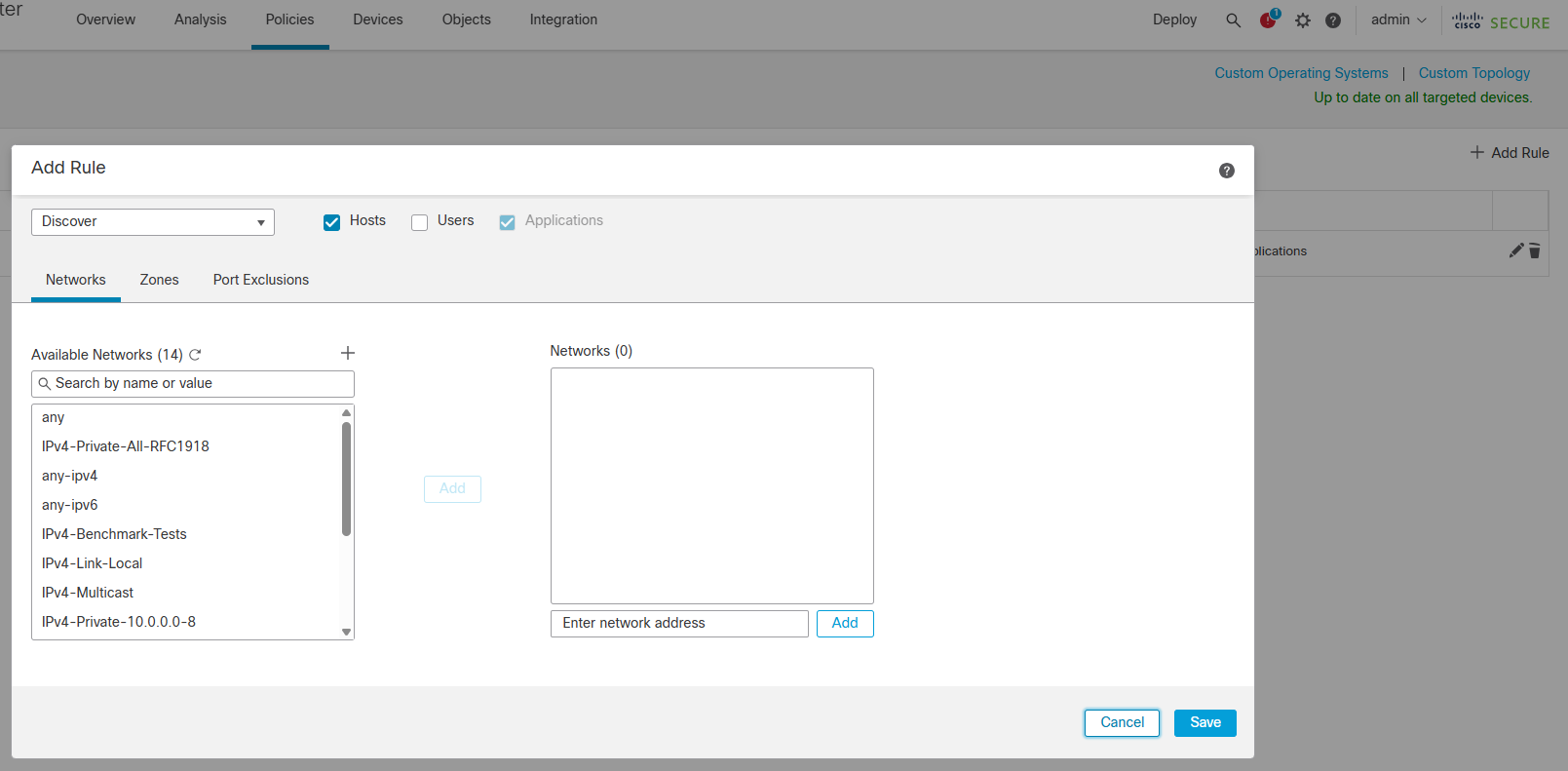 FMC >analysis > hosts > network MAP 확인.