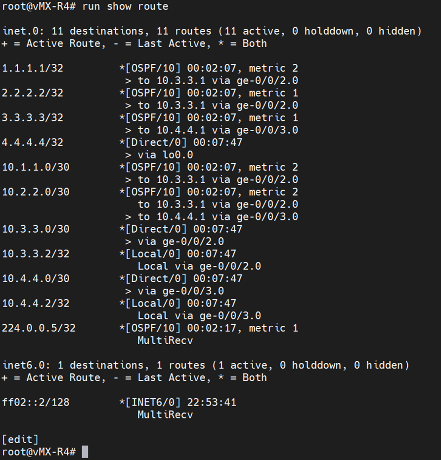 | R4: [edit] root@R4# set protocols ospf area 0.0.0.0 interface ge-0/0/2.0 [edit] root@R4# set protocols ospf area 0.0.0.0 interface ge-0/0/3.0 [edit] root@R4# set protocols ospf area 0.0.0.0 interface lo0.0 |
