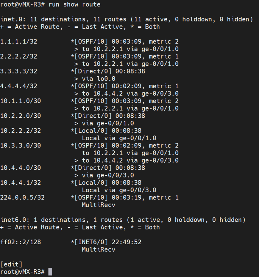 | R3: [edit] root@R3# set protocols ospf area 0.0.0.0 interface ge-0/0/1.0 [edit] root@R3# set protocols ospf area 0.0.0.0 interface ge-0/0/3.0 [edit] root@R3# set protocols ospf area 0.0.0.0 interface lo0.0 |
