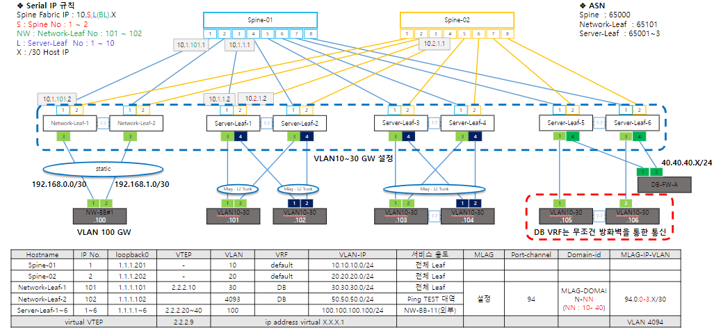 - ServerLeaf-5 , ServerLeaf-6 과 연결된 DB-FW-A(방화벽) 구간을 MLAG-VARP로 묶음.