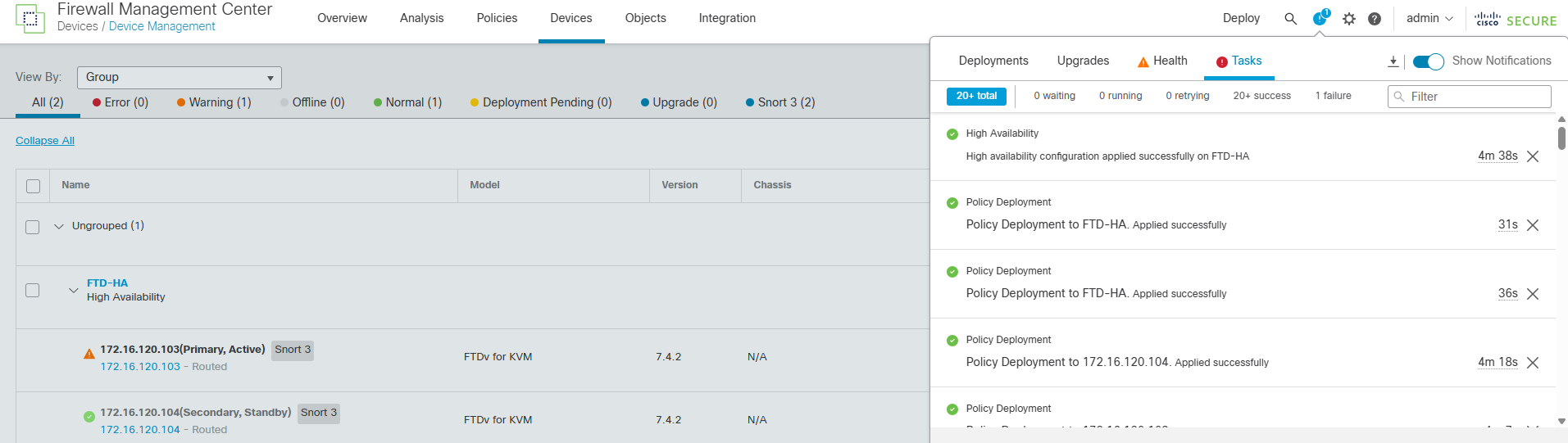 CCIE Security/Cisco FTD FMC Cisco Firewall Threat Defense with FMC : HA구성 Lewis Joo 2025. 4. 18. 14:44 HA 클릭 FTD-HA이름으로 HA구성을진행합니다. YES클릭 ADD 클릭 HA 구성 진행중.. HA Complete. 전체 구성도 현재 HQ 진행중. TASKs- HA 기다리는중. Complete. 인터페이스 Zone 설정. 설정완료 Deploy Deploy Complete. 진정한 HA를 위한 가상 MAC 지정. 가상 MAC 지원 standby IP 주소 제공.